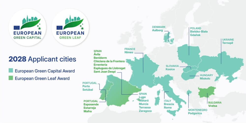 У категорії міст із населенням понад 100 тисяч мешканців за звання «Європейська зелена столиця 2028» змагаються 17 міст із різних країн: Aalborg (Данія), Bielsko-Biała та Gdańsk (Польща), Brescia та Rome (Італія), Košice (Словаччина), Lugo, Mataró, Murcia, Terrassa та Zaragoza (Іспанія), Miskolc (Угорщина), Nîmes (Франція), Podgorica (Чорногорія), Porto і Setúbal (Португалія). І серед них – Тернопіль, єдине місто з України у цьому переліку.